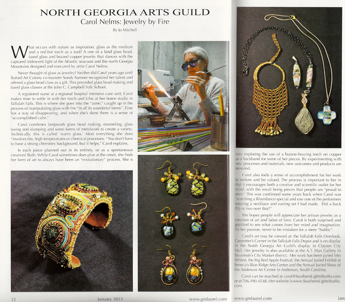 The ArtWorking out of her home studio in the Shenandoah Valley near Winchester VA, Carol creates one-of-a-kind artisan jewelry pieces out of fused glass, metals, and fire. Glass fusing is heat manipulation by a very slow, controlled kiln-baking of glass in order to change the molecular structure of the glass itself. The pieces first "slump" together and then fuse (at about 1450°F) to form into a solid piece. In many pieces, Carol combines plain glass with compatible dichroic glass. The dichroic glass gives her pieces the radiant depth so particular to this art media. Dichroic glass has long been used by astronomers to refract and transmit light simultaneously. Some recent works have incorporated butane brazing of copper. Carol experiments with a variety of materials and heat sources in an ever-evolving creative process. "You don't have to have a strong chemistry background," she says,"but it helps." In addition to creating artisan jewelry for day-to-day and special occasion wear, Carol also produces elaborate artistic works. Her work has been juried into: